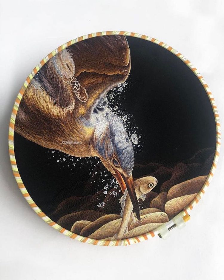 Thoạt nhìn, cảnh tượng ấn tượng về một con chim bói cá lặn xuống nước trong bức ảnh có thể khiến bạn nghĩ rằng đây là một khung cảnh thực tế được nhiếp ảnh gia ghi lại. Nhưng, hãy nhìn lại. Tất cả đều được tạo ra bằng các sợi chỉ thêu. Hình ảnh đáng kinh ngạc này là tác phẩm của những người thợ thêu tại XQ Việt Nam, họ đã tạo ra những tác phẩm chân thực đến kinh ngạc chỉ bằng một cây kim và những sợi chỉ màu.