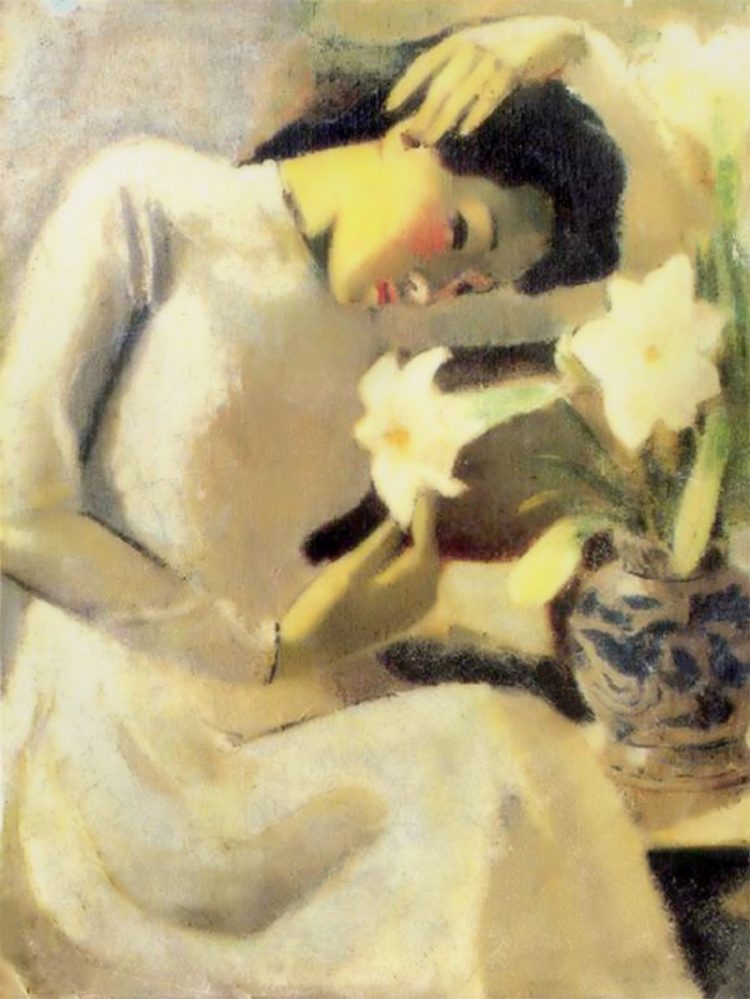 Bằng việc vẽ những lớp sơn dầu mỏng tang, cô thiếu nữ tầm tuổi đôi mươi trong tà áo dài trắng, trầm tư bên những cánh hoa huệ tây, như hiện lên cùng sự trong trẻo của tâm hồn. Sự tài tình của bức tranh chính là việc họa sĩ tạo ra một đường cong khép kín giữa bông hoa và hai cánh tay, khiến cho khuôn mặt của cô gái trở thành trọng tâm của khuôn hình. Ở đó, sắc đỏ duy nhất ửng lên gò má, đôi môi làm bức tranh càng trở nên quyến rũ.