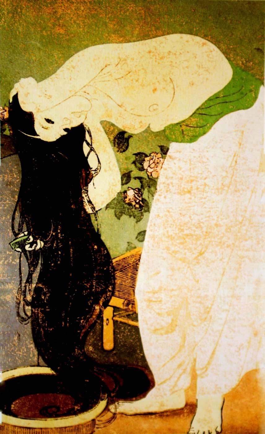 Tác phẩm vẽ ra một hình ảnh quen thuộc về một người thiếu phụ ngực trần đang khom lưng xõa tóc chải đầu. Với gam màu nhuần nhị trắng, xanh, những nét khắc tỉ mỉ thể hiện ra trên mái tóc đổ tràn, cách tạo hình ngón tay cô gái và hai bông hoa hồng lấp ló phía sau, ta như cảm nhận được bức tranh này đã thoát thoai hoàn toàn ra khỏi ảnh hưởng của lối khắc gỗ dân gian Đông Hồ. Ở đó hiện lên một tinh thần mới học được từ các tranh khắc gỗ màu của Nhật Bản nhưng lại khơi gợi lên sự giản dị tinh tế của tâm hồn người Việt.