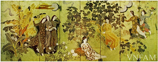 Bên cạnh sơn dầu, khắc gỗ, nghệ thuật tranh sơn mài là một thành tựu vô cùng rực rỡ của hội họa Việt Nam buổi đầu. Năm 1932, khi chất liệu sơn ta trong nghệ thuật truyền thống Việt được chính thức được cải biến kỹ thuật để trở thành một chất liệu của Hội họa hiện đại Việt Nam với công lao của nghệ nhân Đinh Văn Thành, hàng loạt các tác phẩm tranh sơn mài của các họa sĩ Việt đã ghi nhận những dấu ấn không thể phai mờ. Trong đó, bức bình phong 8 tấm ghép “Thiếu nữ trong vườn” của Nguyễn Gia Trí là một điển hỉnh.