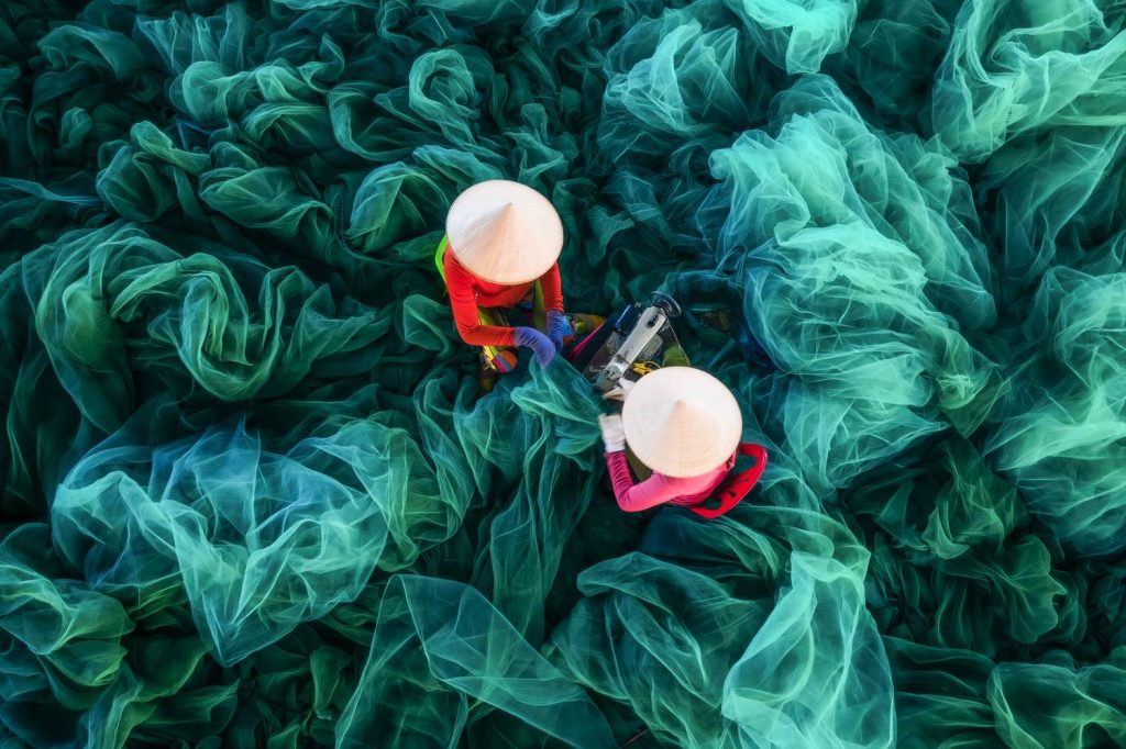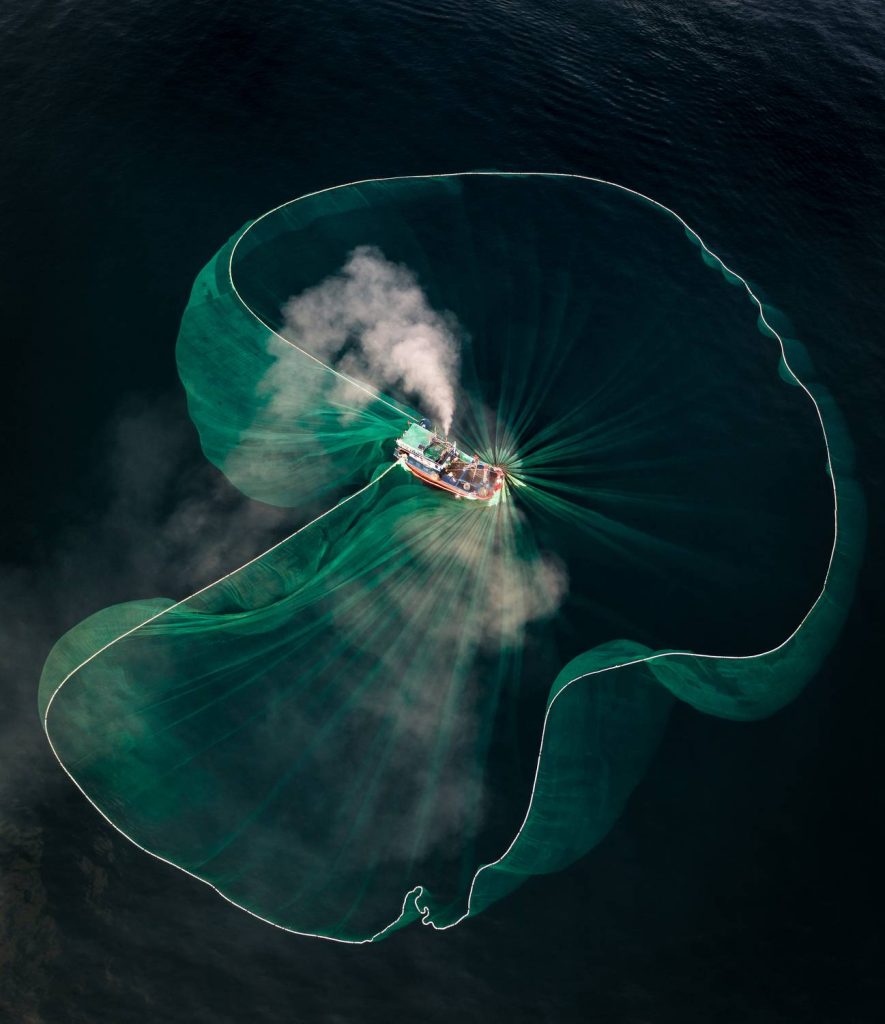 Đạt giải nhì hạng mục ảnh drone là bức Bắt cá buổi sớm của Nguyễn Ngọc Thiện (TP HCM) chụp thuyền đánh cá đang kéo lưới trong mùa đánh bắt cá cơm tại vùng biển Tuy Hòa, Phú Yên. Tác giả còn một tác phẩm khác là Vũ điệu lưới chụp tại vùng biển Hòn Yến, Phú Yên, vào top 100 ảnh drone.