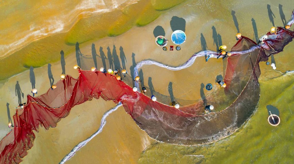 Tác phẩm Điệp khúc của biển của tác giả Nguyễn Thanh Hải (Hà Tĩnh) chụp quá trình kéo lưới rùng ở bờ biển Lộc Hà, Hà Tĩnh. Thanh Hải có tác phẩm Đánh ruốc bằng te gắn vào đầu thuyền máy chụp tại vùng biển Thạch Hà, Hà Tĩnh cũng vào top 100 ảnh drone.